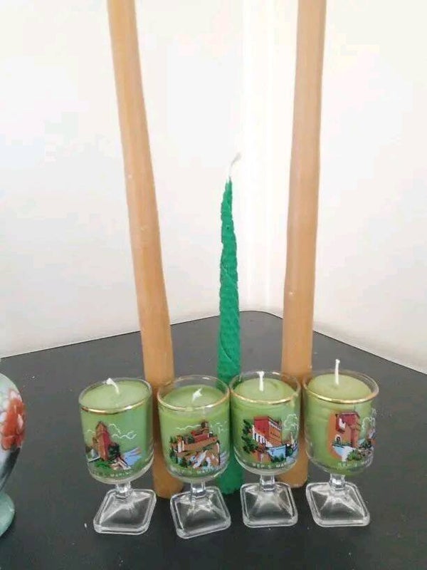 Setti 4kpl Snapsilasi kynttilöitä, 2 kpl Isoa Antiikkikynttilää, 1kpl vihreä kartiokynttilä., sekä ruusun kuva maljakko kynttilä